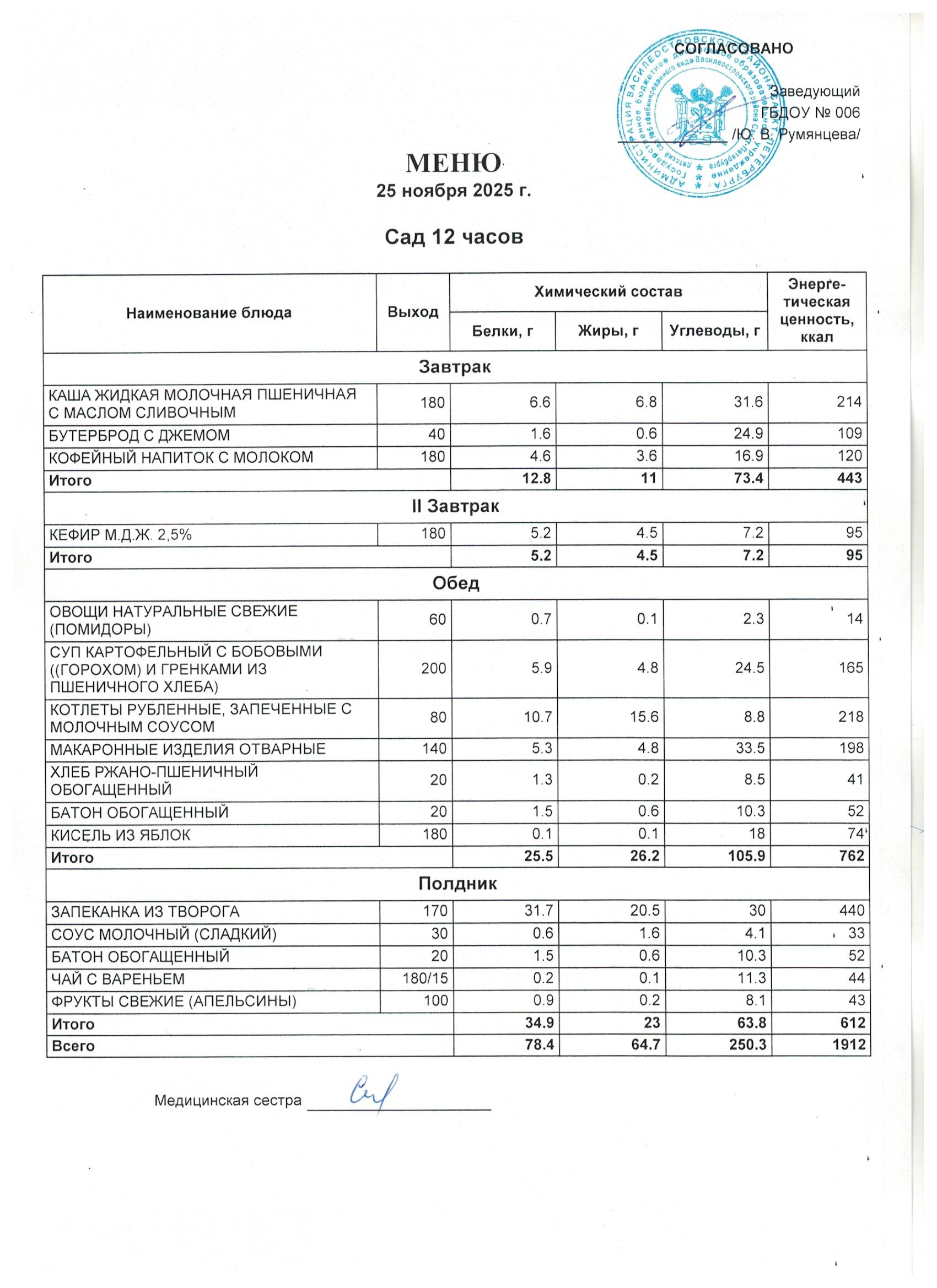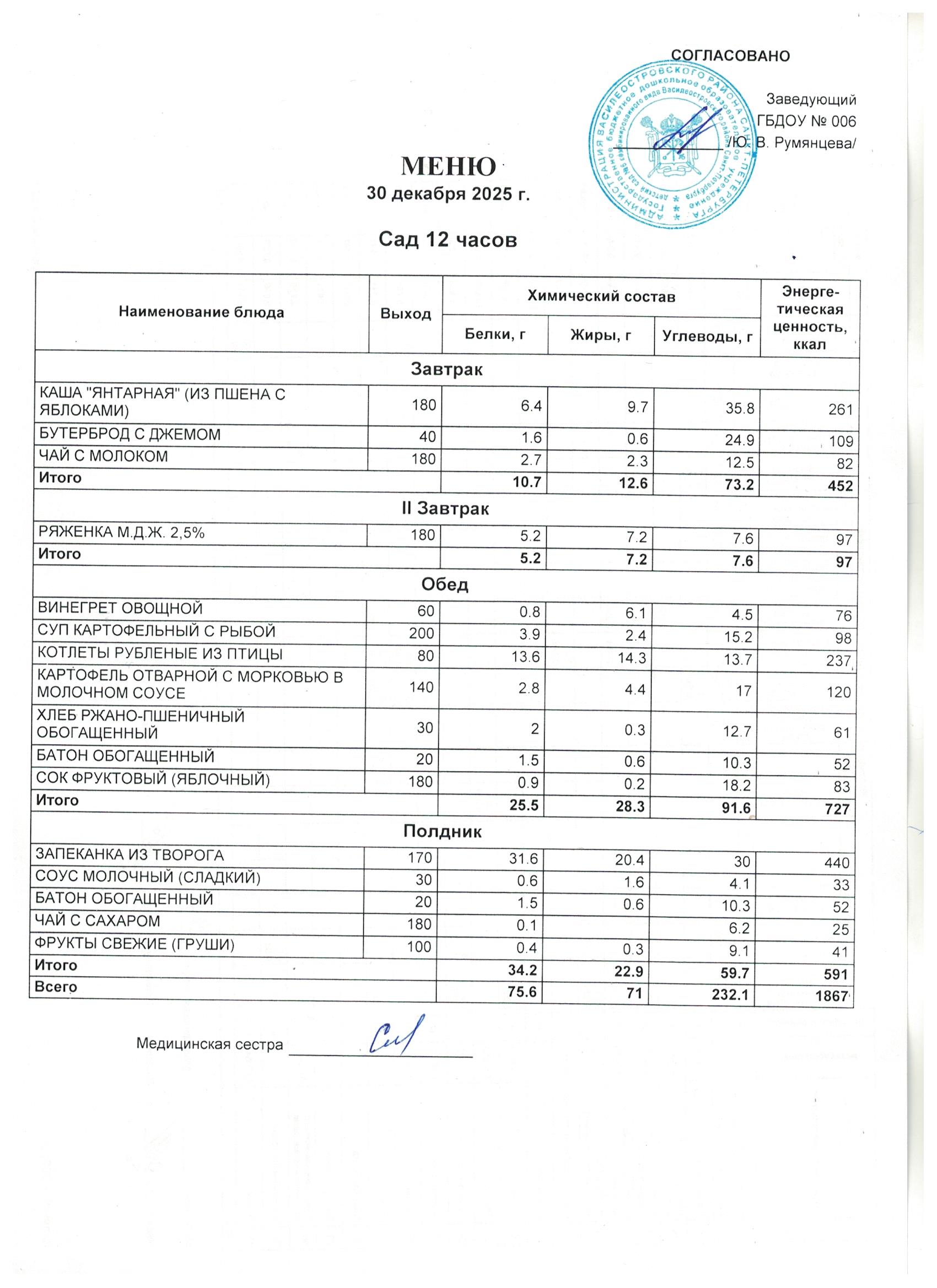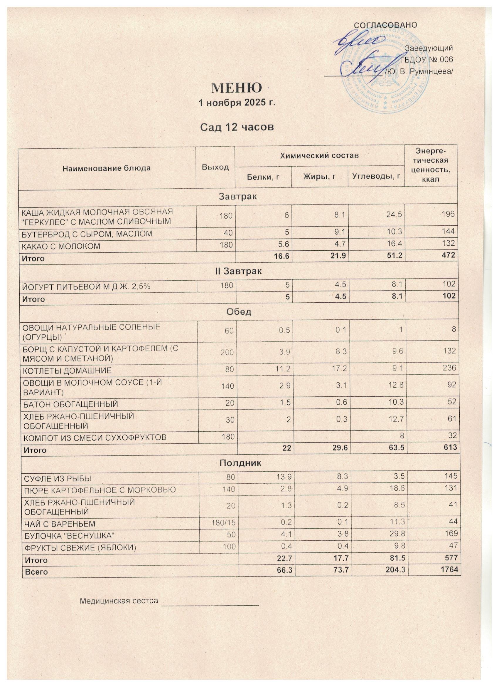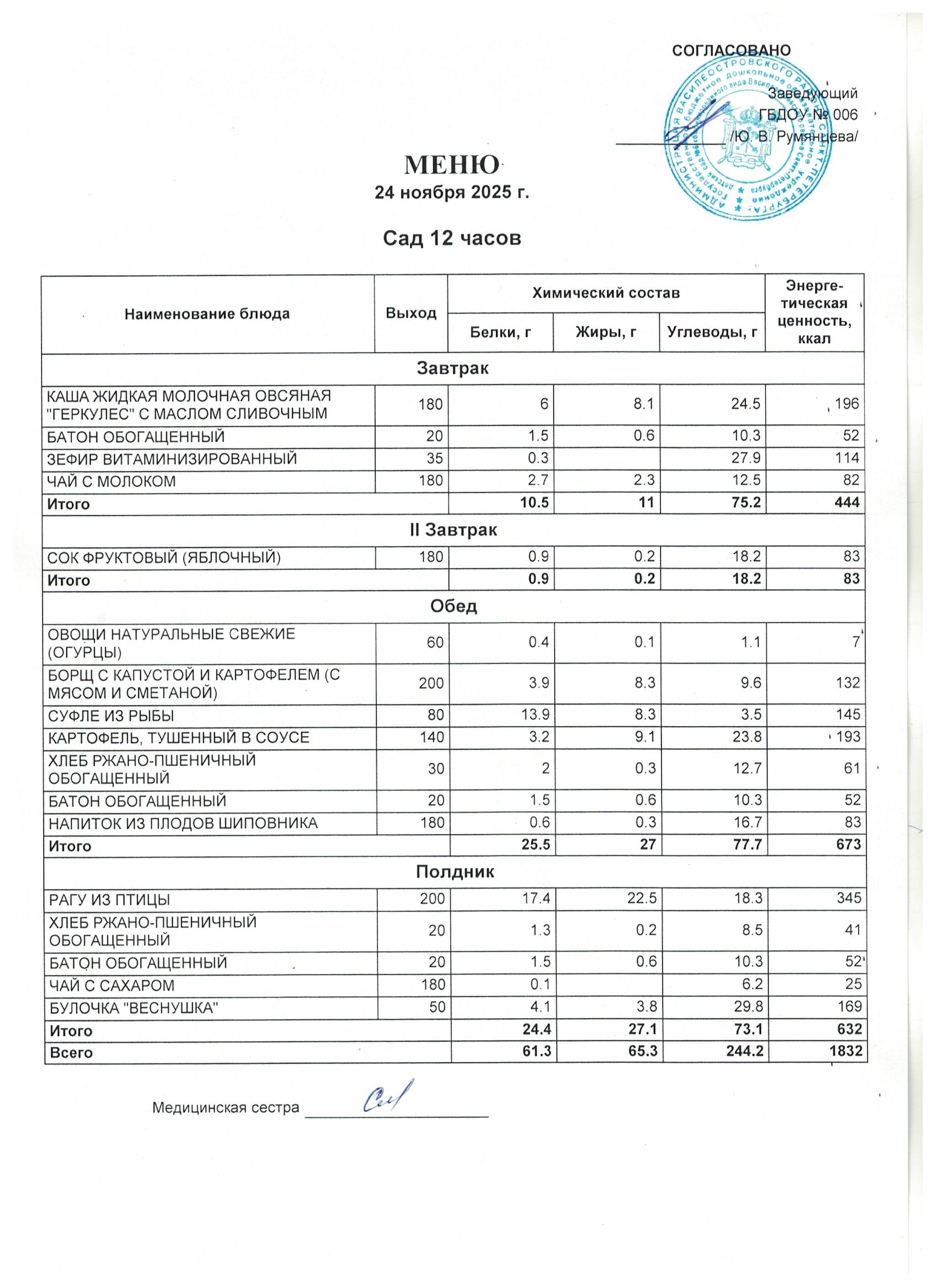 Приказ от 09.01.2025 № 1/24-ОД Об утверждении меню в ГБДОУ д/с № 6 в 2025 году