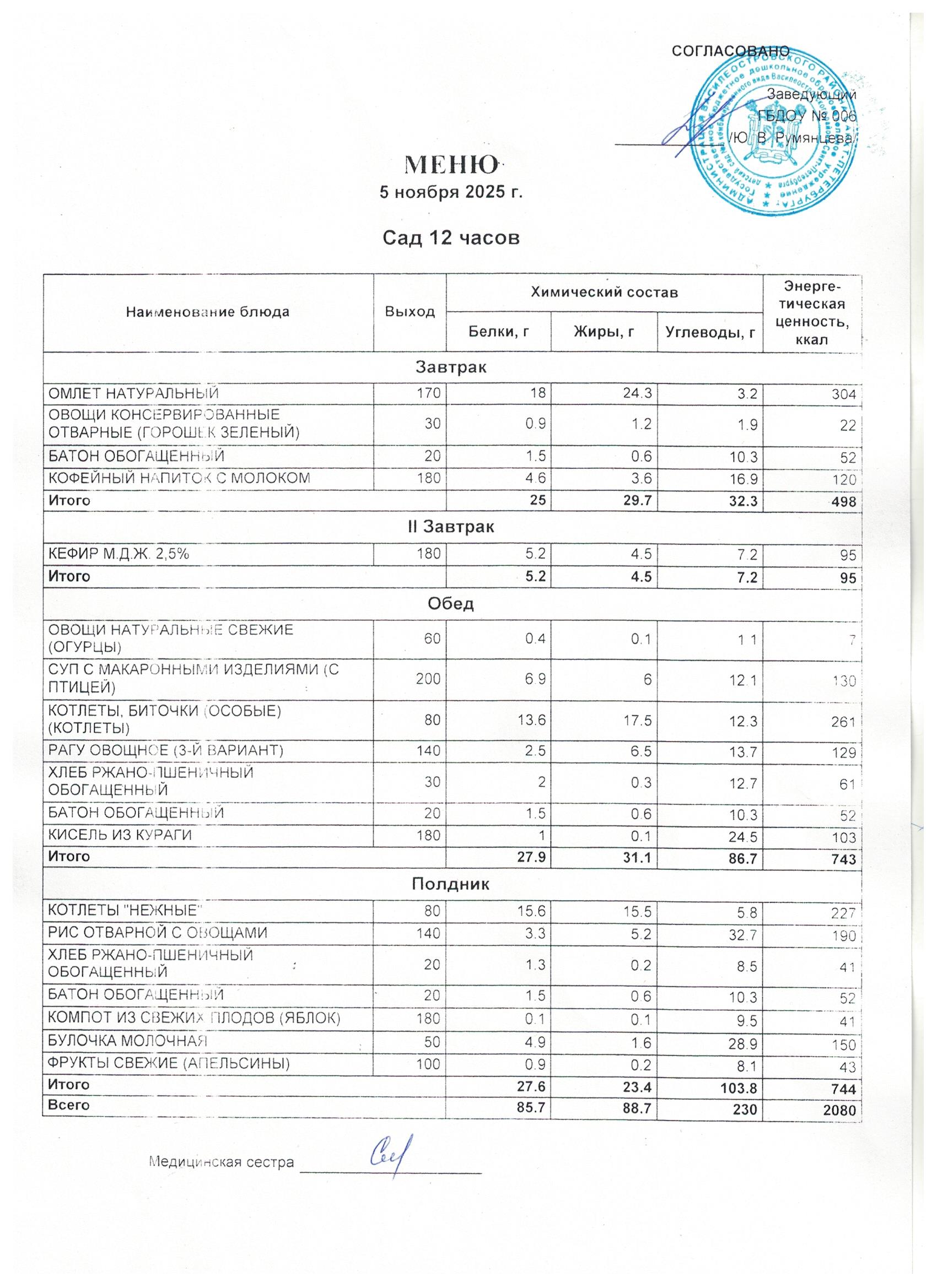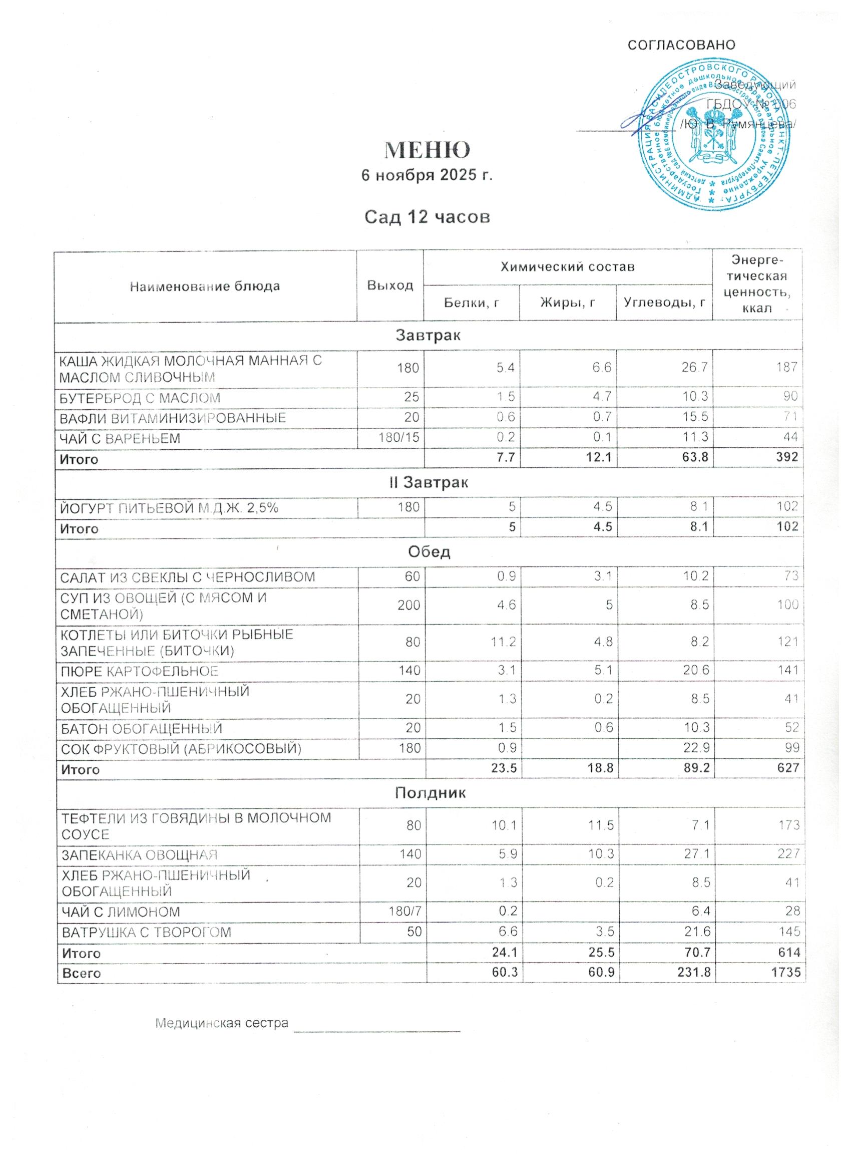 6 день цикличного десятидневное меню для организации питания детей в возрасте от 3 до 7 лет, посещающих с 12-часовым пребыванием дошкольные образовательные учреждения, в соответствии с физиологическими нормами потребления продуктов питания, с технологическими картами приготовления