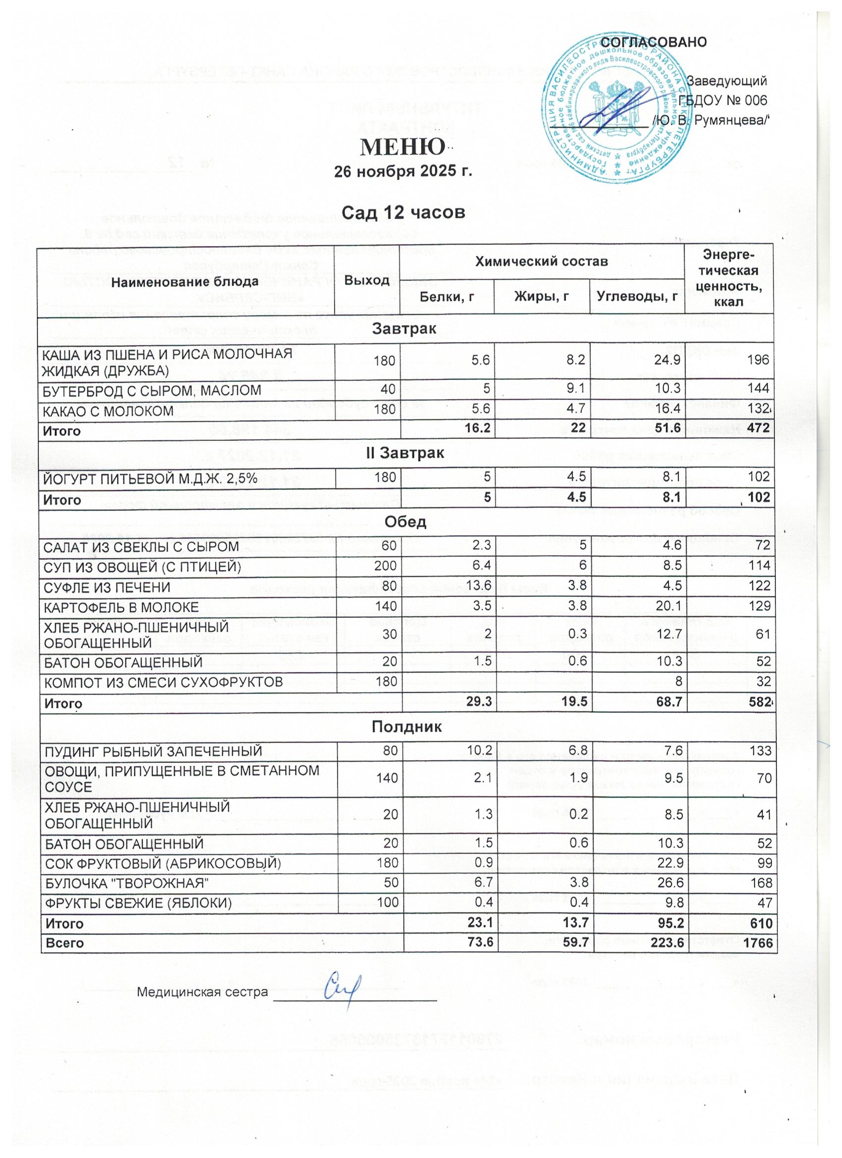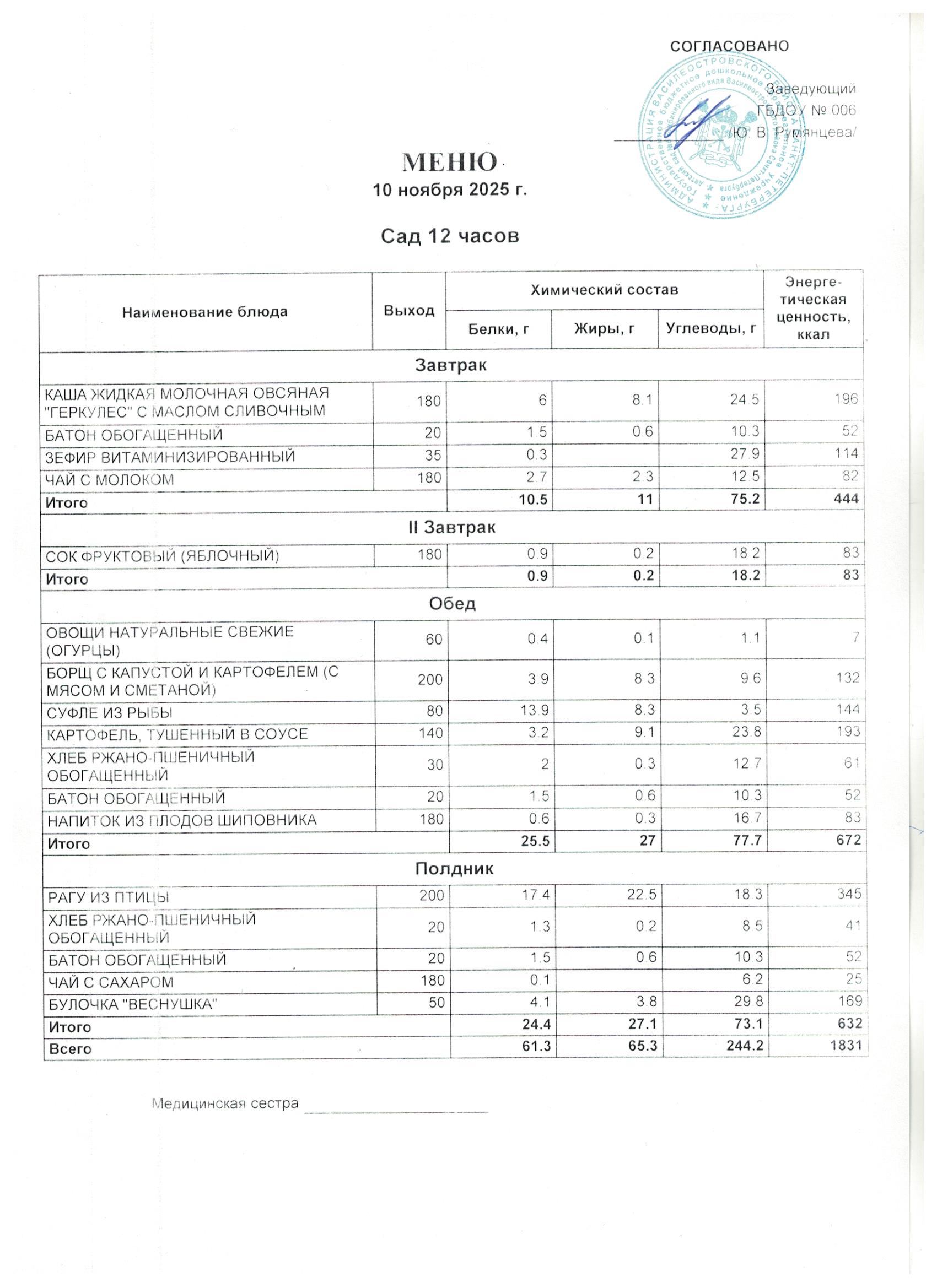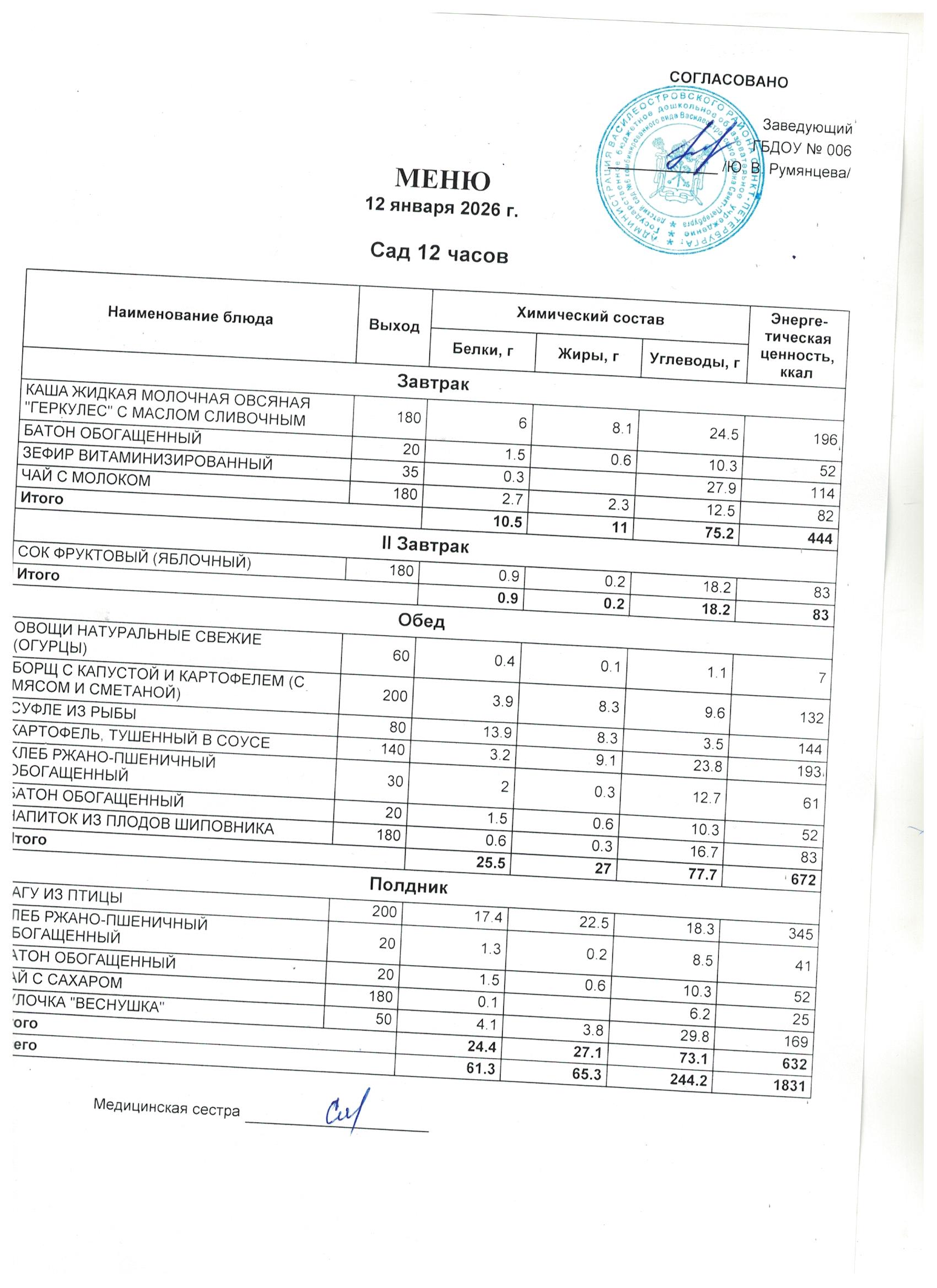 1 день цикличного десятидневное меню для организации питания детей в возрасте от 3 до 7 лет, посещающих с 12-часовым пребыванием дошкольные образовательные учреждения, в соответствии с физиологическими нормами потребления продуктов питания, с технологическими картами приготовления