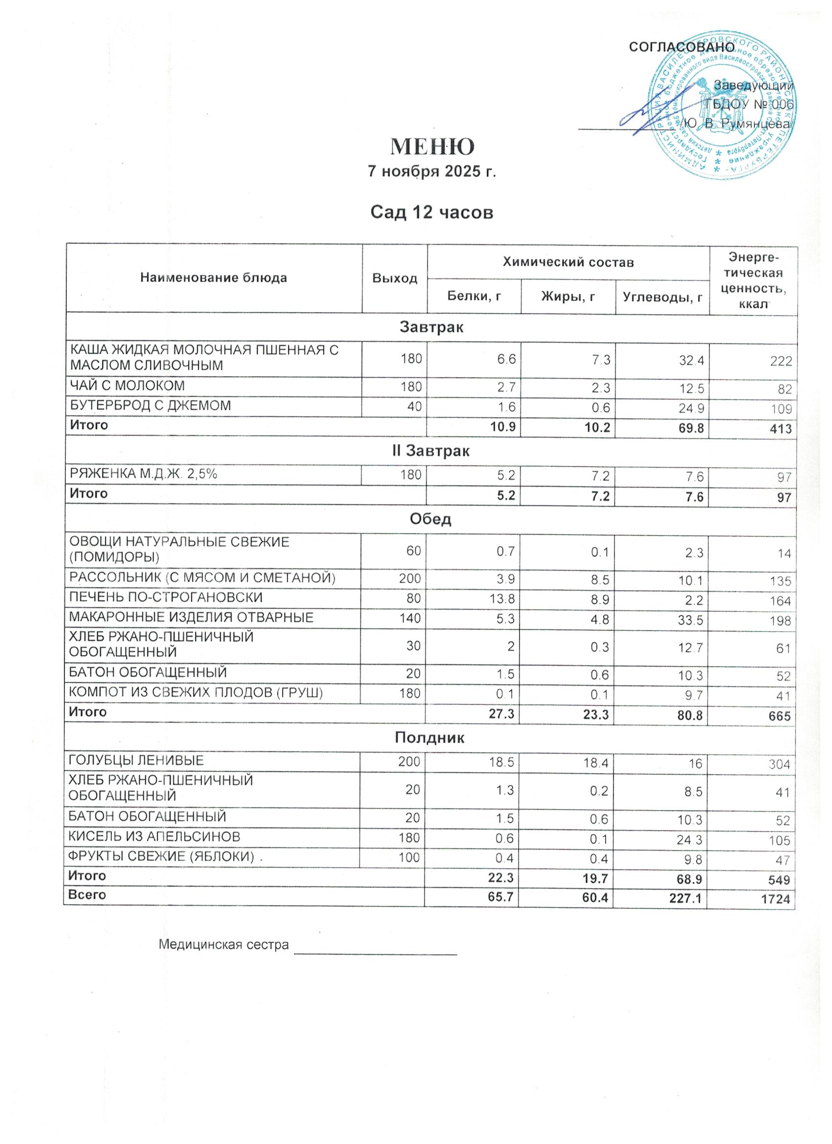 7 день цикличного десятидневное меню для организации питания детей в возрасте от 3 до 7 лет, посещающих с 12-часовым пребыванием дошкольные образовательные учреждения, в соответствии с физиологическими нормами потребления продуктов питания, с технологическими картами приготовления